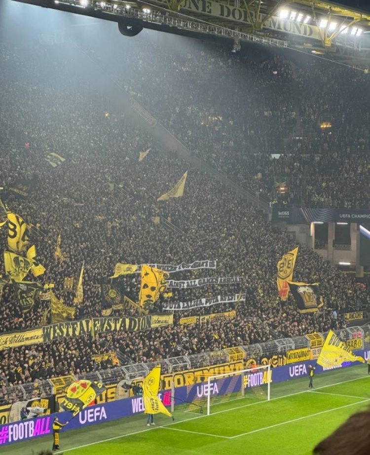多特蒙德球迷在比赛中拉出的横幅写谈:“心之所向等于家,反对统共国外赛事。去他妈的西甲,去他妈的西班牙足协。”
