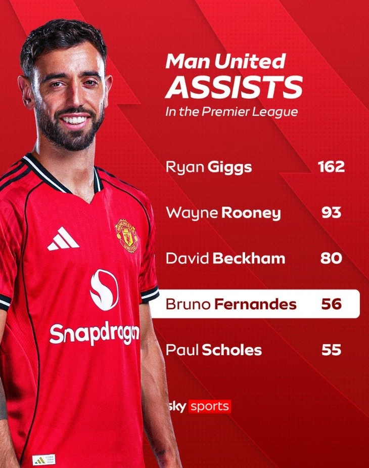 B费曼联生存英超助攻数依然达到56次,格外名宿斯科尔斯,以下为曼联队史英超助攻榜: