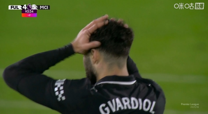 12月03日讯 曼城vs富勒姆第93分钟,格瓦迪奥尔扣门被挡出,这下后续镜头给到,格瓦直拍我方的头!