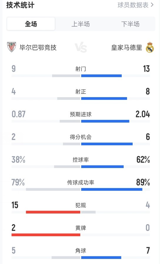 毕巴0-3皇马全场:射门9-13,射正4-8,控球率38%-62%,犯规15-4