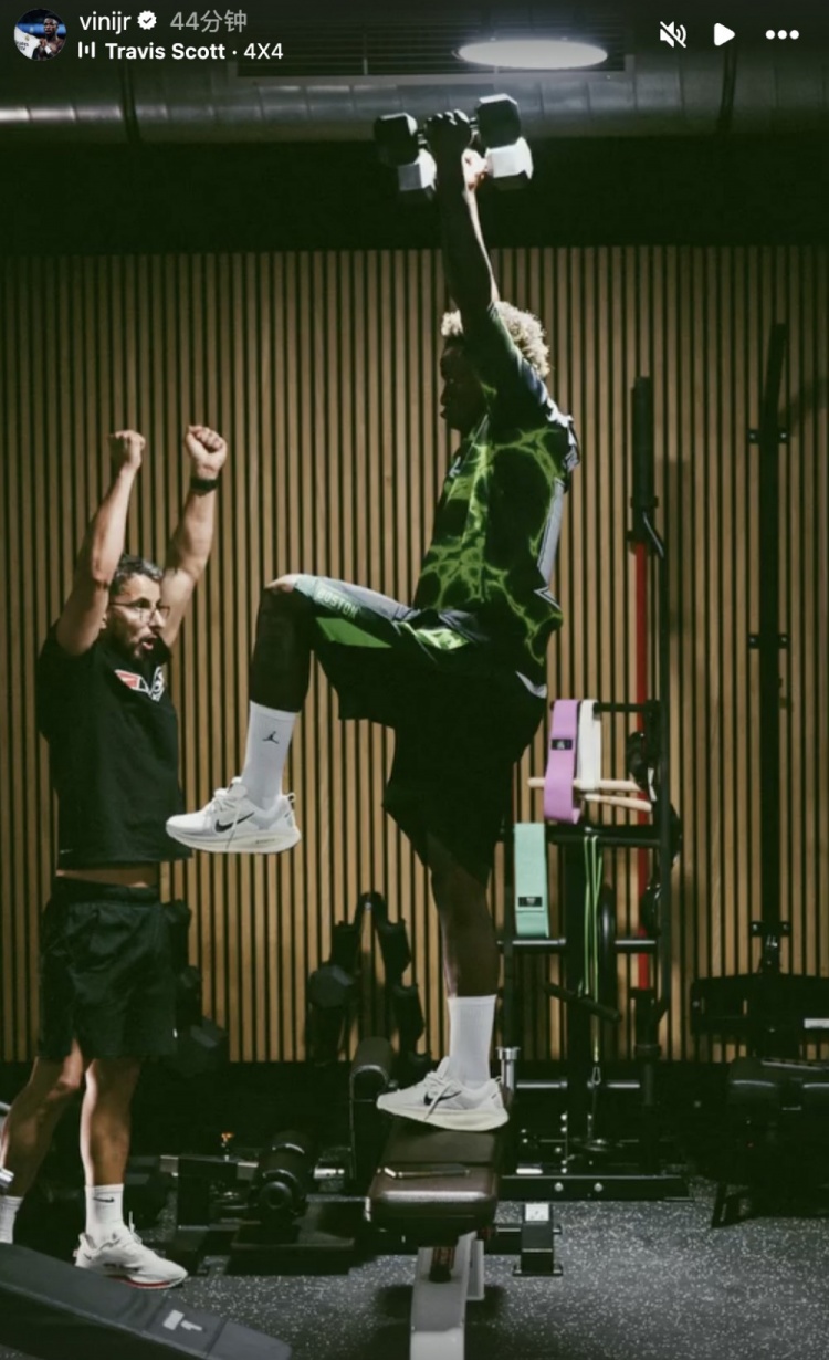 像片中,这位巴西边锋身穿绿色覆按服,在体能阐发注解的随同下进行力量覆按,画面涌现他正高举哑铃,颜料专注,状况极佳。尽管现在处于休赛期,维尼修斯也曾保执体能覆按,积极备战新赛季。