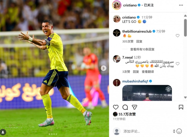 助攻菲利克斯破门,C罗社媒晒照庆祝告捷,配文:LET’S GO !