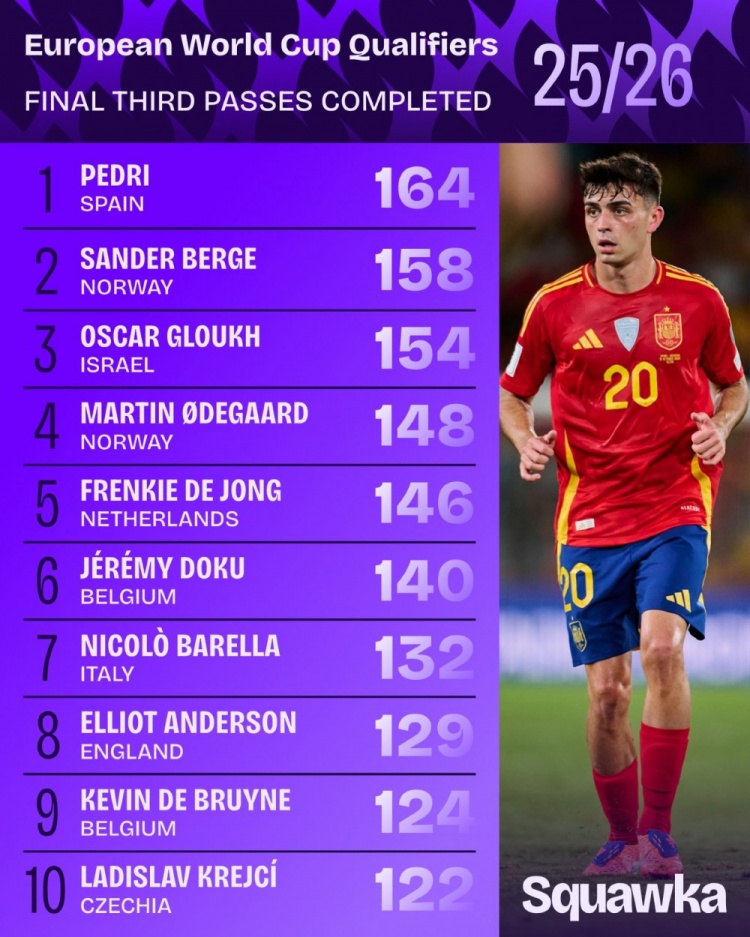 10月15日讯 Squawka列出了欧洲世初赛弥留三区奏效传球名次,西班牙中场佩德里居首。