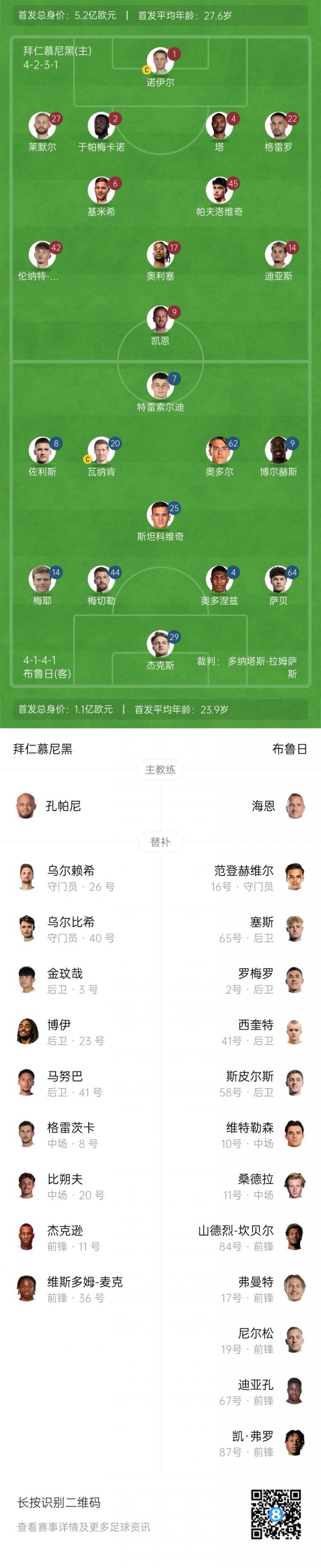 拜仁首发:1-诺伊尔、2-于帕梅卡诺、4-塔、22-格雷罗、6-基米希、27-莱默尔、45-帕夫洛维奇、14-迪亚斯、17-奥利塞、42-伦纳特·卡尔、9-凯恩