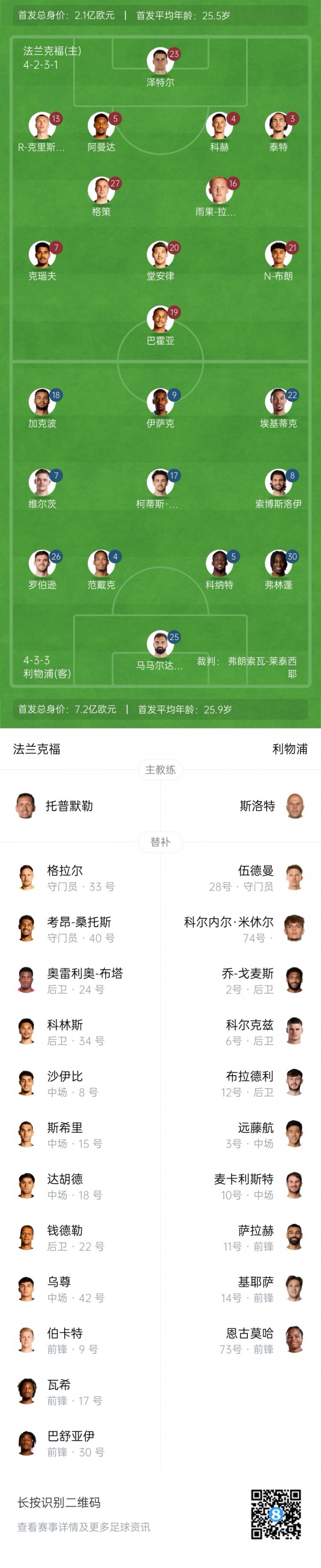 10月23日讯 欧冠联赛阶段第3轮,利物浦客战法兰克福,赛前两边首发公布。【利物浦方面,伊萨克、维尔茨、加克波总共先发,埃基蒂克将面临旧主;法兰克福方面,堂安律、拉尔森、布朗领衔先发】