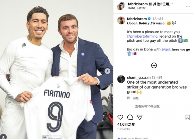 罗马诺写谈:“哦哦哦是菲尔米诺!很欢欣和你会面,你在场上有着传闻般的进展,不仅如斯,赛场外的你魔力完全。在卡塔尔联赛渡过了充实的一天,Here We Go!”