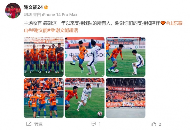 中超第29轮,泰山队主场2-1校服津门虎,这亦然泰山队赛季主场收官战。赛后,谢文能更新社媒顾忌,他写谈:主场收官 感谢这一年以来复旧球队的通盘东谈主,谢谢你们的复旧和陪同。