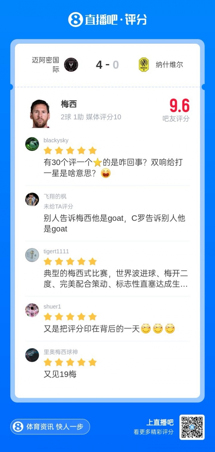 梅西2球1助解锁400助,超3600吧友评分唯有9.6分