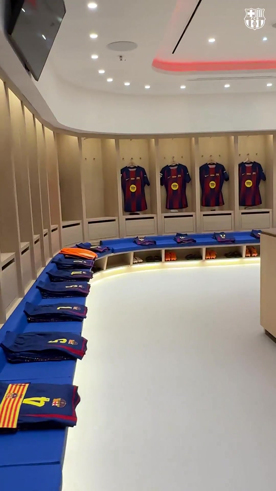 赛前,巴萨社媒晒出新诺坎普的巴萨更衣室画面,球员的球衣一经摆放达成。