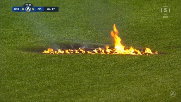 主队左迁!瑞典北雪平球迷比赛时向球场投掷烟花,导致草坪着火