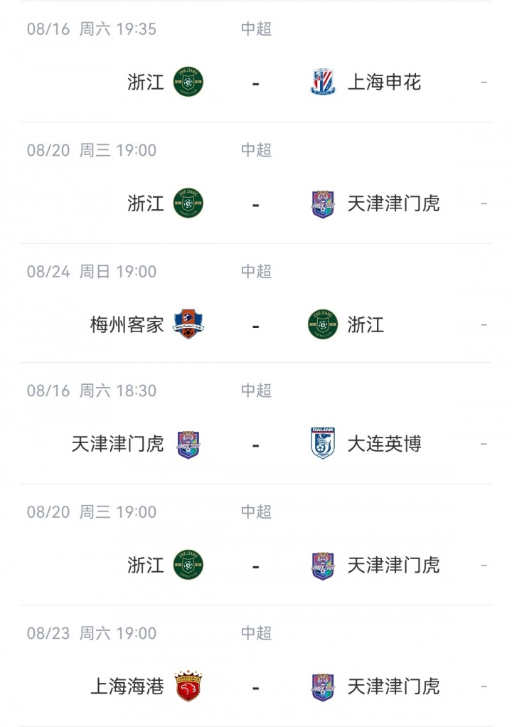 其中浙江vs天津津门虎,原定8月30日19:00进行,现退换至8月20日19:35进行。这一退换使得浙江队和津门虎靠近恐怖的密集赛程。