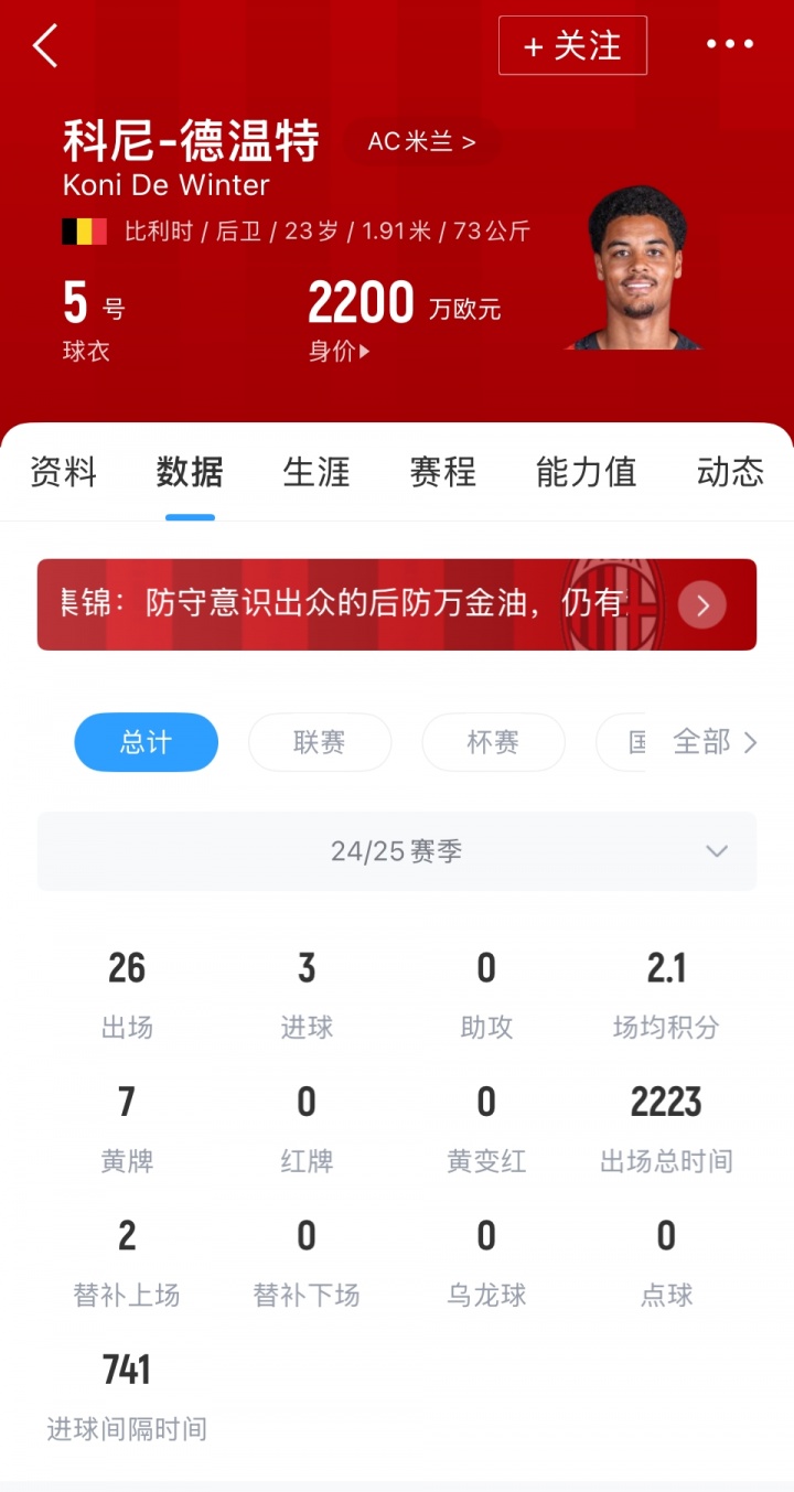 德温特现年23岁,比利时籍,身高1米91,上赛季为热那亚出场26场,身价2200万欧元。