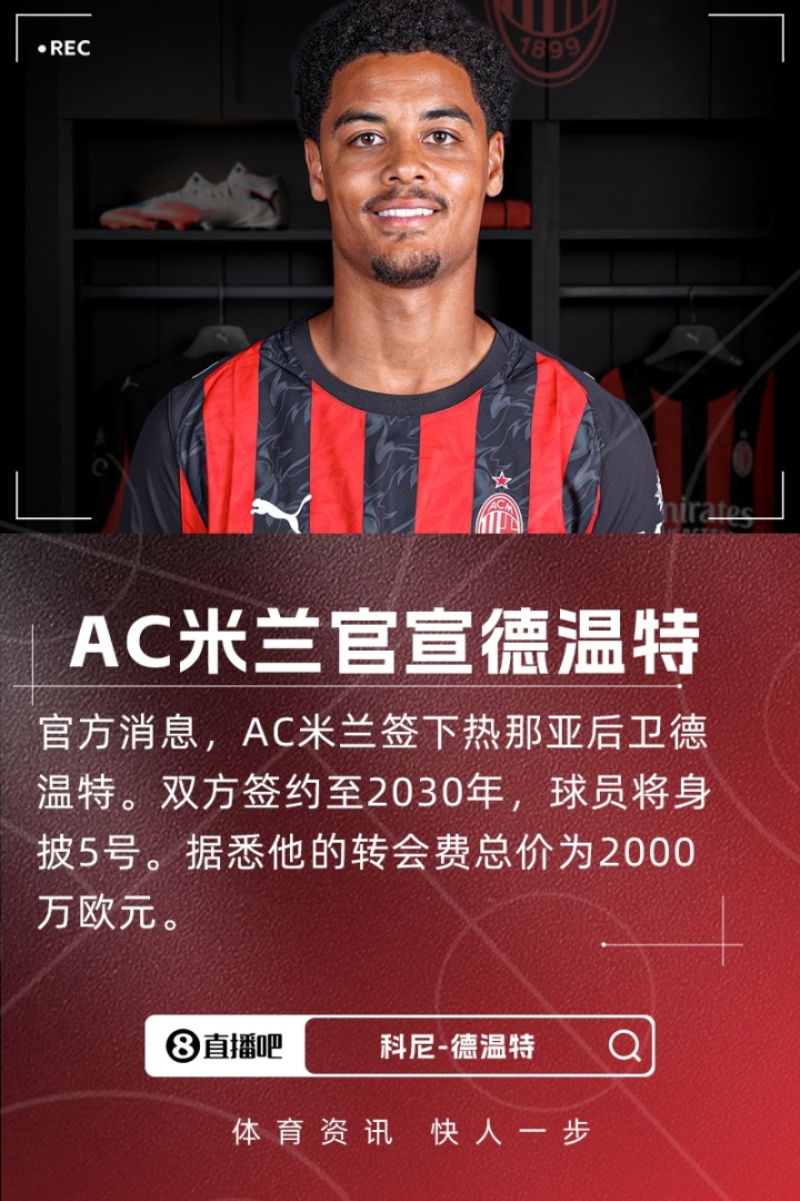 08月13日讯 官方音信,AC米兰签下热那亚后卫德温特。两边签约至2030年,球员将身披5号。
