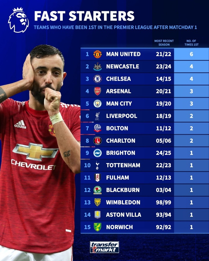 08月15日讯 新赛季英超开赛在即,德转列出了哪些球队在英超第一轮后占据榜首的次数最多,曼联以6次排名第一。