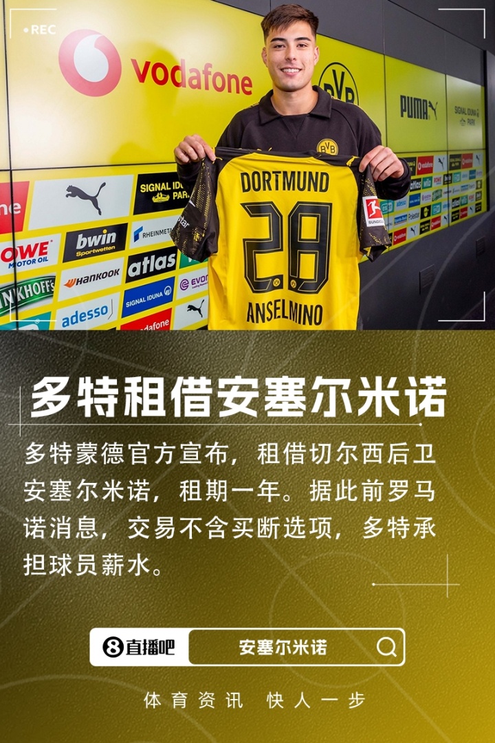 08月27日讯 官方音问,20岁切尔西后卫安塞尔米诺租赁多特一个赛季,无买断选项。