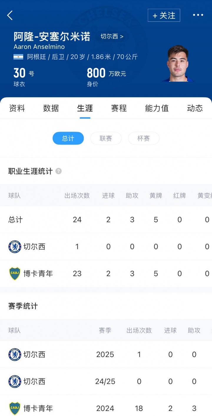 20岁的安塞尔米诺是切尔西前年夏窗从博卡后生签下的球员,他在今夏随切尔西取得世俱杯,仅代表切尔西出场过1次。