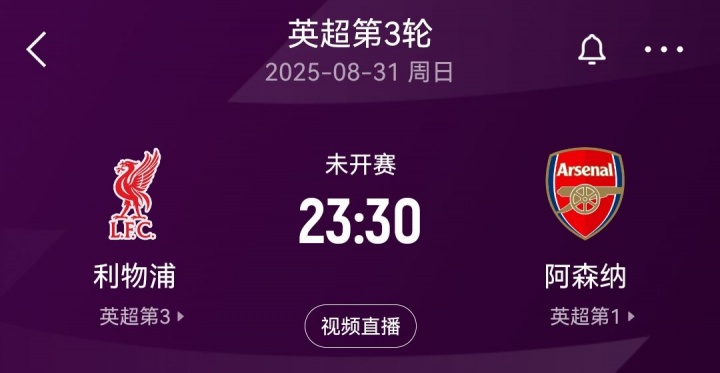 北京时间8月31日晚23:30,英超第3轮,利物浦将镇守主场迎战阿森纳。