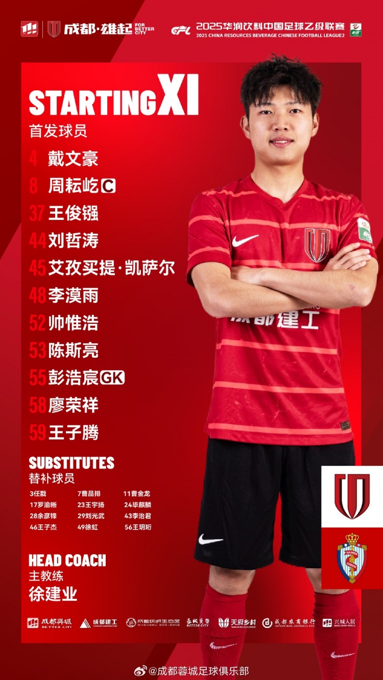 比赛首发名单出炉!蓉城后生军,雄起!