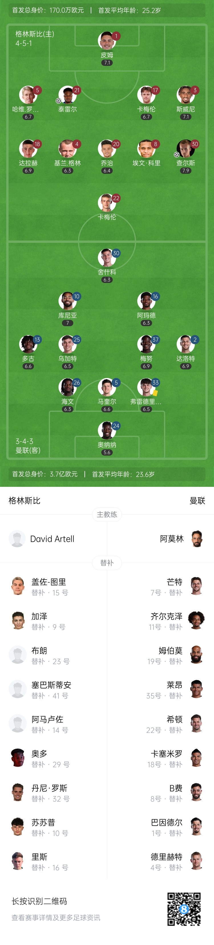 第30分钟,格林斯比左侧角球契机,传中到禁区中,奥纳纳出击造作,沃伦将球打进佛门!曼联0-2过期格林斯比↓