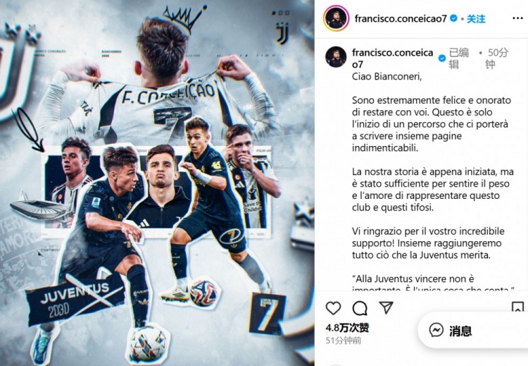 “咱们的故事才刚刚运行,但这一经足以让我感受到代表这个俱乐部和这些球迷的重量与爱。感谢你们难以置信的相沿!咱们将一齐扫尾尤文应得的一切。”