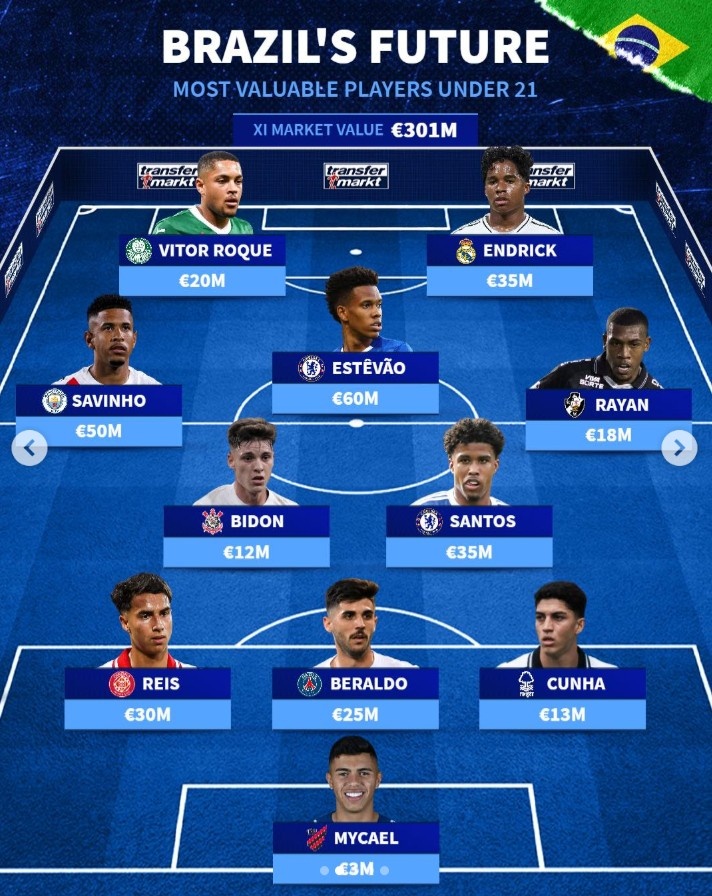 中场:布雷诺-比顿(科林蒂安,1200万欧)、安德烈-桑托斯(切尔西,3500万欧)、萨维尼奥(曼城,5000万欧)、埃斯特旺(切尔西,6000万欧)、拉扬(达伽马,1800万欧)