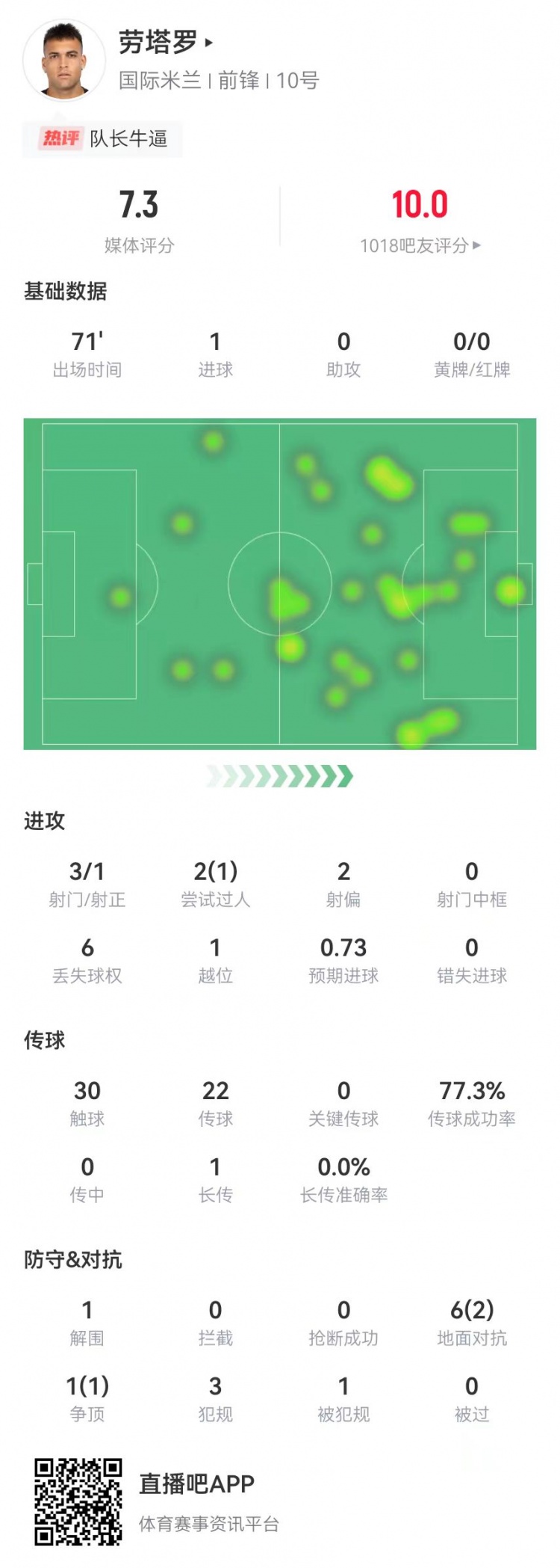 劳塔罗本场3射1正进1球+1越位 7反抗3见效+3犯规 获评7.3分