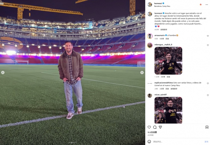 梅西写说念:昨晚我重归一处我魂牵梦萦的所在。阿谁曾让我无比幸福的所在,你们让我多半次成为世上最幸福的东说念主。希望有天我能归来,不啻所以球员身份作别——就像我恒久未能完成的那样……💙❤️