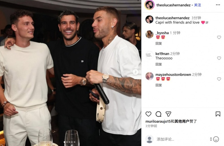 7月23日讯 特奥在个东谈主社媒晒出与伯仲卢卡斯-埃尔南德斯以及法国本族帕瓦尔约会合影,配文写谈:“与一又友们在卡普里岛渡过有爱的时光。”