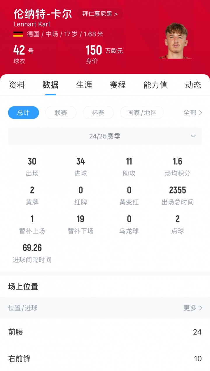 拜仁的青训小将伦纳特-卡尔在三场热身赛中发达出色,共孝顺了2球1助,总监弗洛因德也在采访中暗示新赛季会期待他的发达。