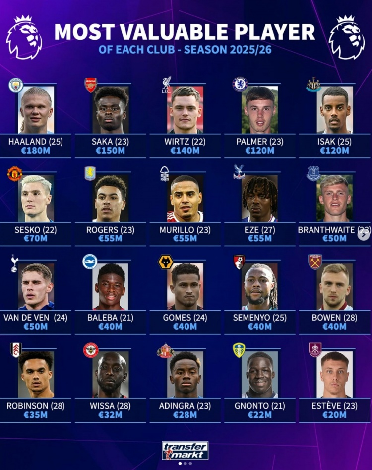8月17日讯 新赛季英超照旧开幕,德转也清点了英超20支球队中身价最高的球员,其中哈兰德1.8亿欧领衔,具体如下: