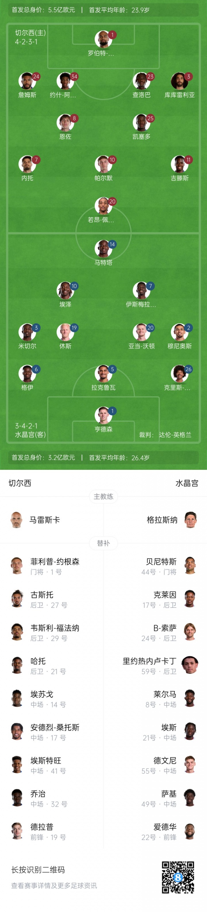 切尔西首发:1-桑切斯、24-詹姆斯、34-约什-阿奇姆彭、23-查洛巴、3-库库雷利亚、25-凯塞多、8-恩佐、10-帕尔默、7-内托、11-吉滕斯、20-若昂-佩德罗