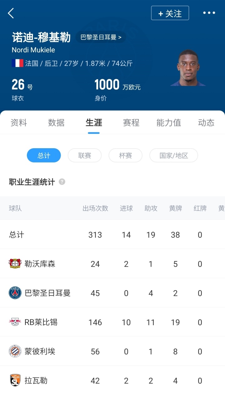 27岁的法国右后卫穆基勒,2022年巴黎破耗1200万欧从莱比锡签下,上赛季球员被巴黎外租至勒沃库森效用,现在德回身价1000万欧。