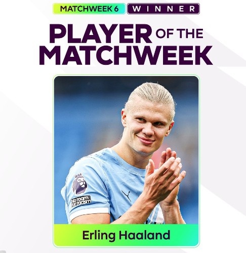 10月1日讯 英超官方公布联赛第六轮最好球员,曼城中锋哈兰德当选。