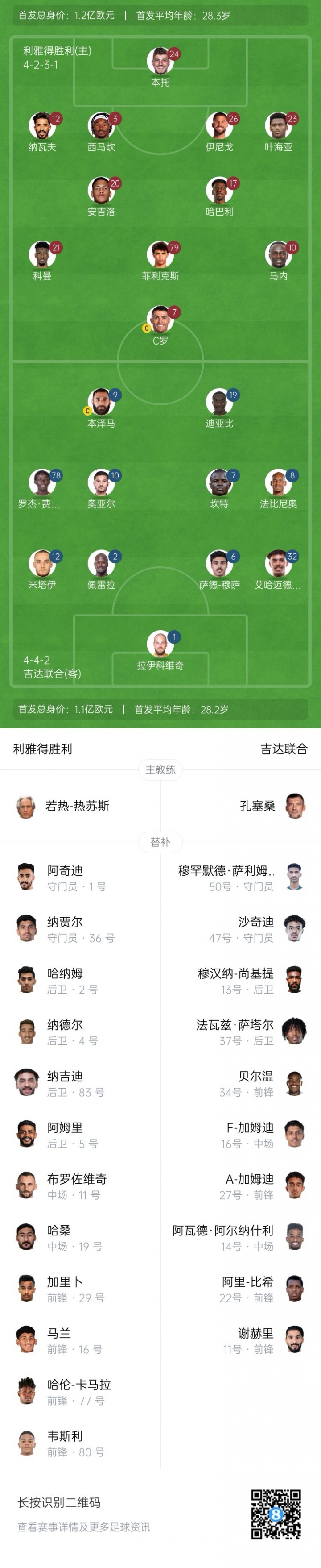 利雅得告捷首发:24- 本托、12-纳瓦夫、3-西马坎、26-伊尼戈·马丁内斯、23-叶海亚、17-哈巴利、20-安吉洛、79-菲利克斯、21-科曼、10-马内、7-C罗
