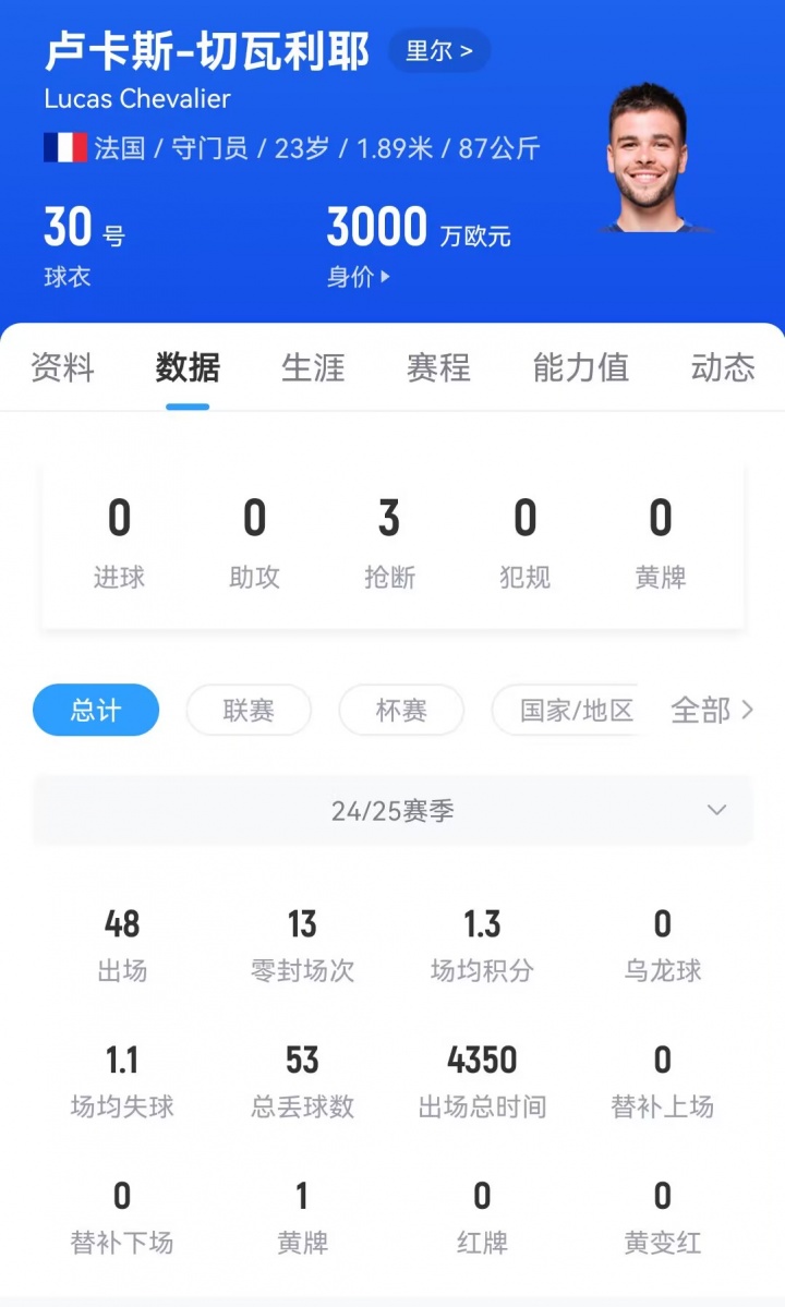现年23岁的法国门将切瓦利耶上赛季为里尔出场48次,获取13场零封,场均失球1.1个。当今其德回身价达3000万欧元。