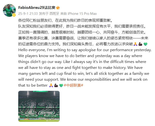 09月01日讯 国安外助法比奥社媒发文,为昨天球队0-6输给泰山的惨败向球迷谈歉。