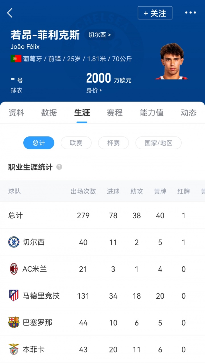 菲利克斯昨年夏窗5200万欧元从马竞转会切尔西,冬窗被外租至AC米兰。