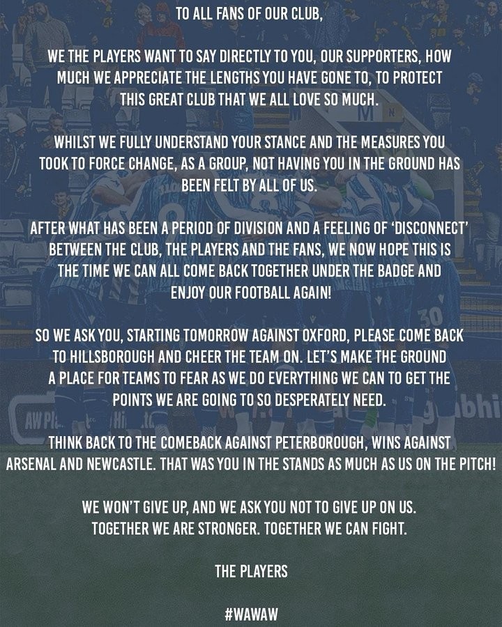 是以咱们央求你们,从未来对阵牛津联的比赛开动,请回到希尔斯堡球场为球队加油壮胆。让咱们把这座球场形成客队懦弱的所在,因为咱们将竭尽所能去争取咱们如斯紧迫需要的积分。