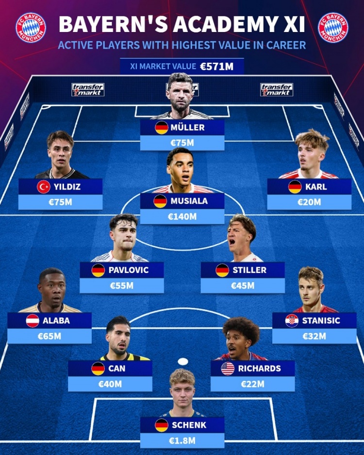 拜仁青训竖立现役球员身价最高威望(取历史最高身价,总价5.71亿欧):
