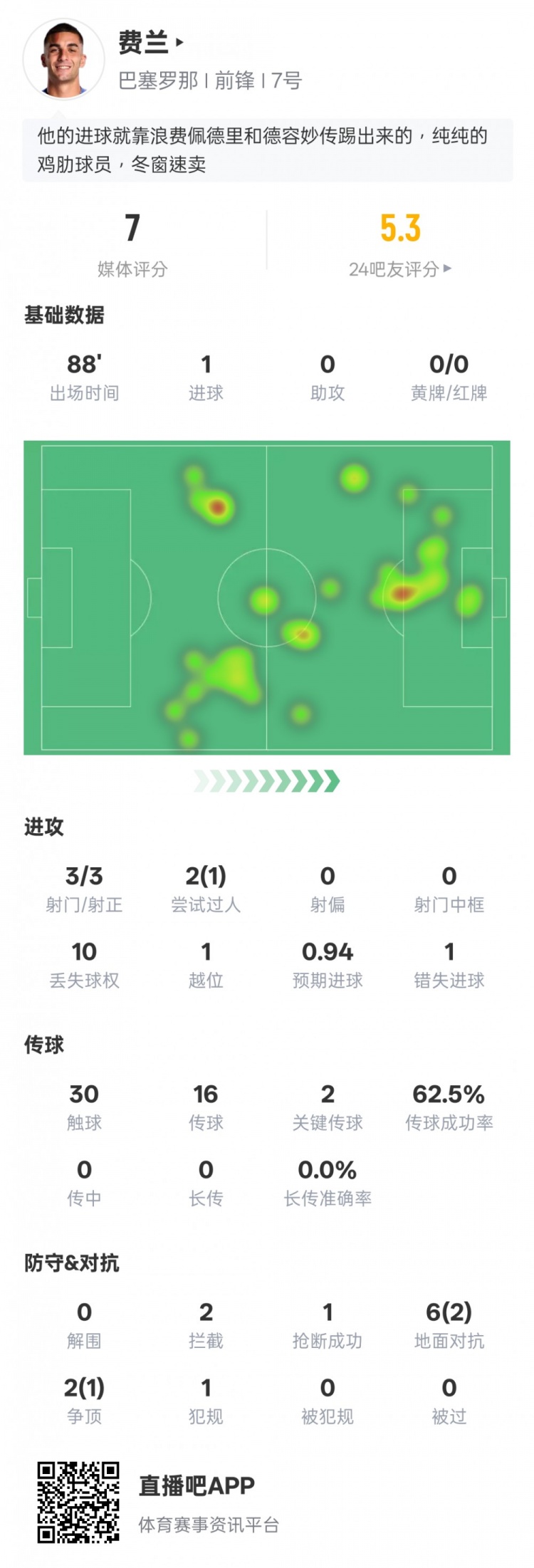 费兰本场数据:1进球2要道传球1过东说念主得手1错失进球契机,评分7.0