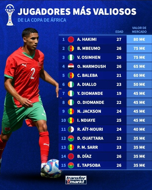 巴萨领跑西甲 非洲杯球员身价榜: 阿什拉夫8000万第一, 姆伯莫、奥斯梅恩7500万