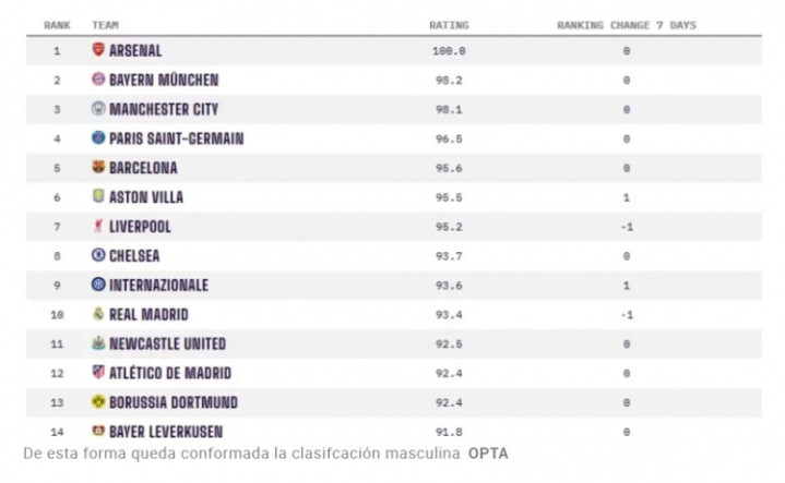 比较之下,男足的排名则有所不同。阿森纳以满分100分位居榜首,拜仁慕尼黑(98.2分)和曼彻斯特城(98.1分)分列第二和第三位。巴黎圣日耳曼(96.5分)和巴塞罗那(95.6分)也名列三甲。皇家马德里男足当今排名第10,评分为93.4分,在最近一次更新中下跌了两个位置。切尔西(第8位,93.7分)和海外米兰(第9位,93.6分)皆发轫了他们。