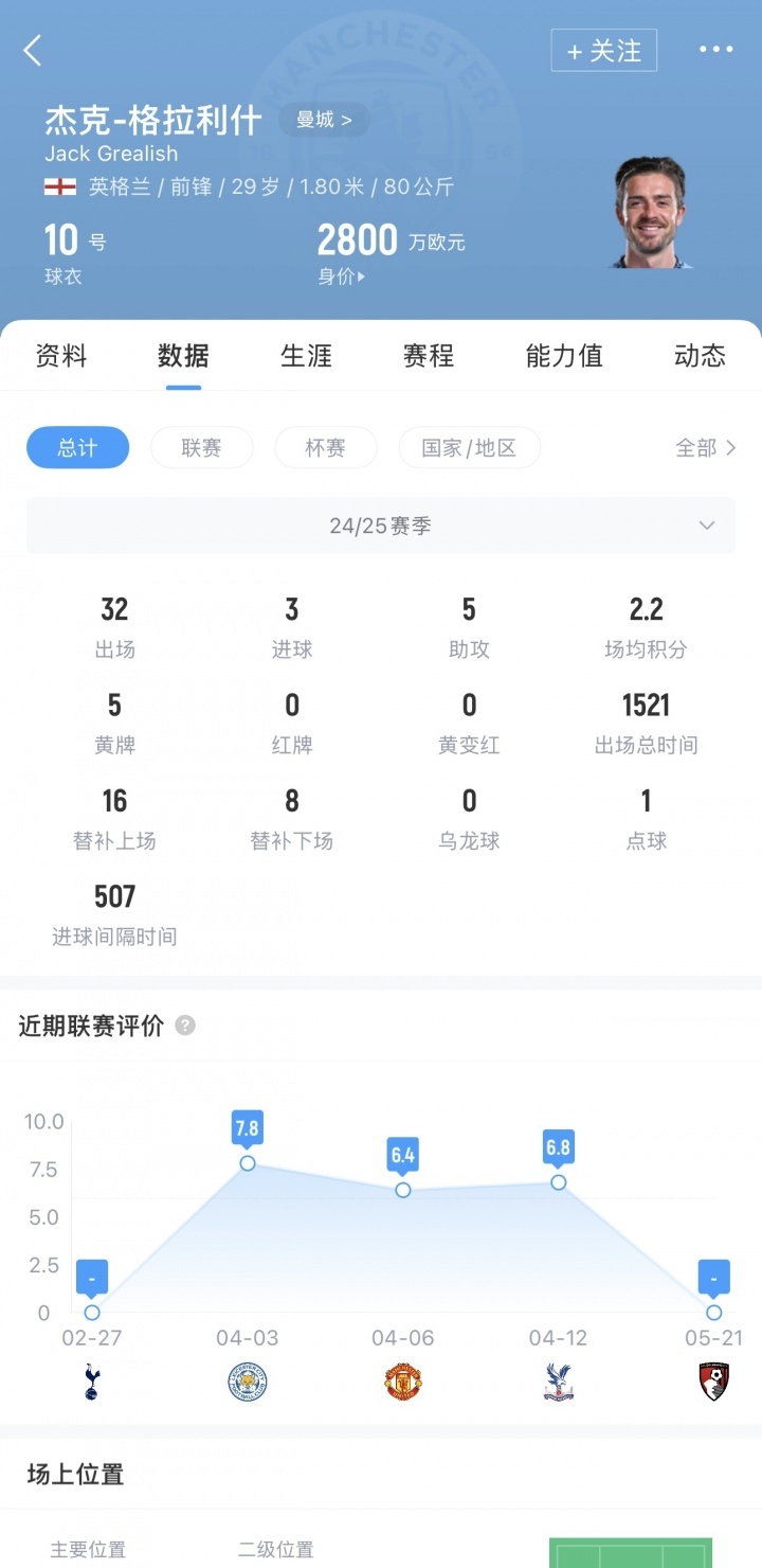 格拉利什2021年夏窗以1.18亿欧元转会费加盟曼城,逼迫现在共为曼城出场157次打入17球23助攻。