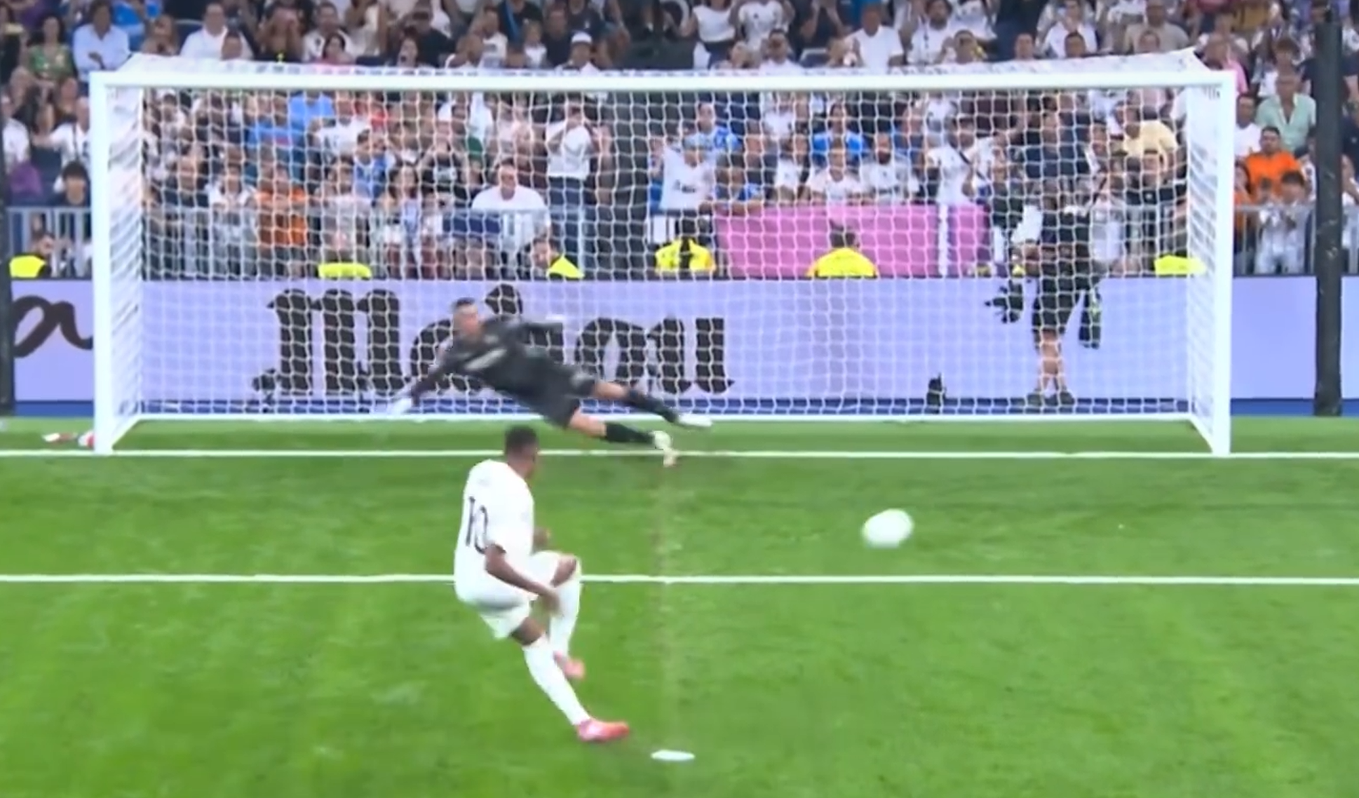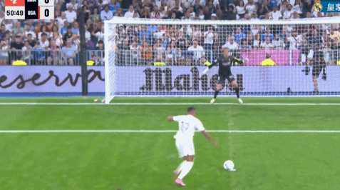 比赛第50分钟,姆巴佩右路内切急停变向被克鲁斯放倒,法国巨星躬行操刀点球射中,打入皇马生存西甲首球。