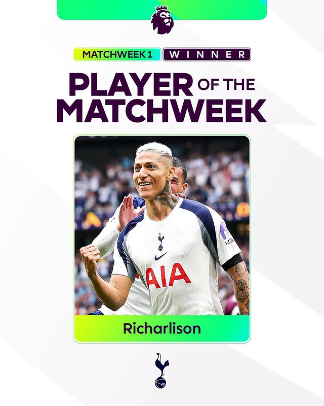 虎扑08月20日讯英超官方告示,热刺时尚里沙利松当选英超首轮球迷票选最好球员。