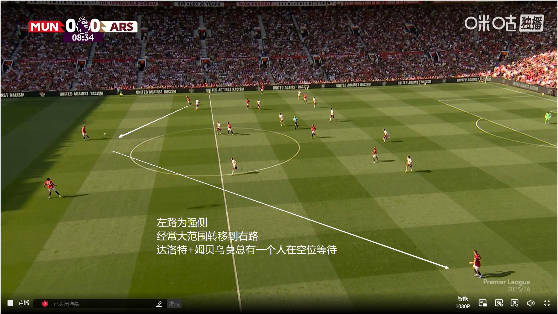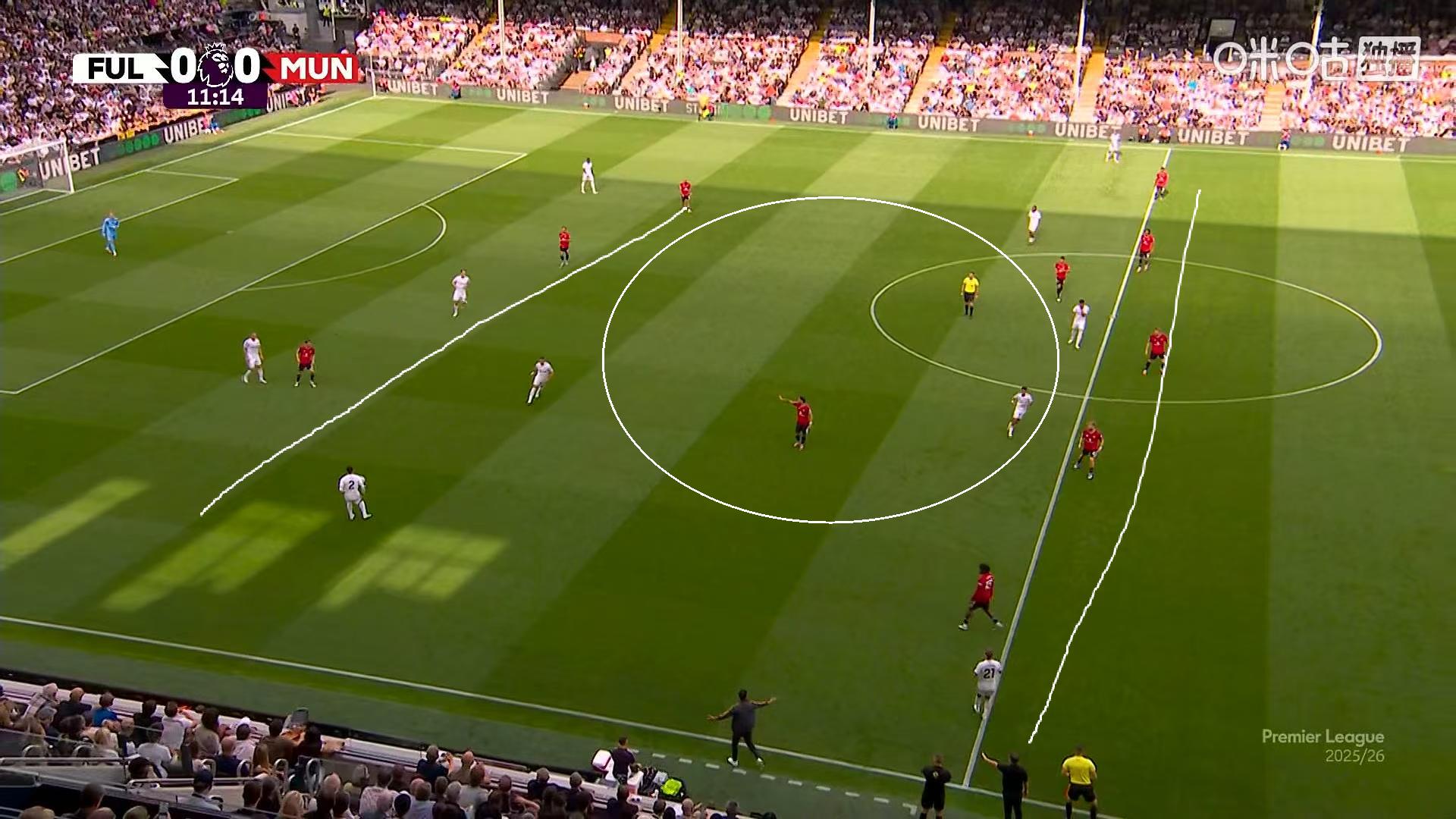 曼联1-1富勒姆的前半段进犯上风,都体当今传中方面了,你望望芒特这一次给库尼亚的横传球(其实可以归类为传中了),你再望望姆贝乌莫的位置,你就知说念姆贝乌莫的定位了。