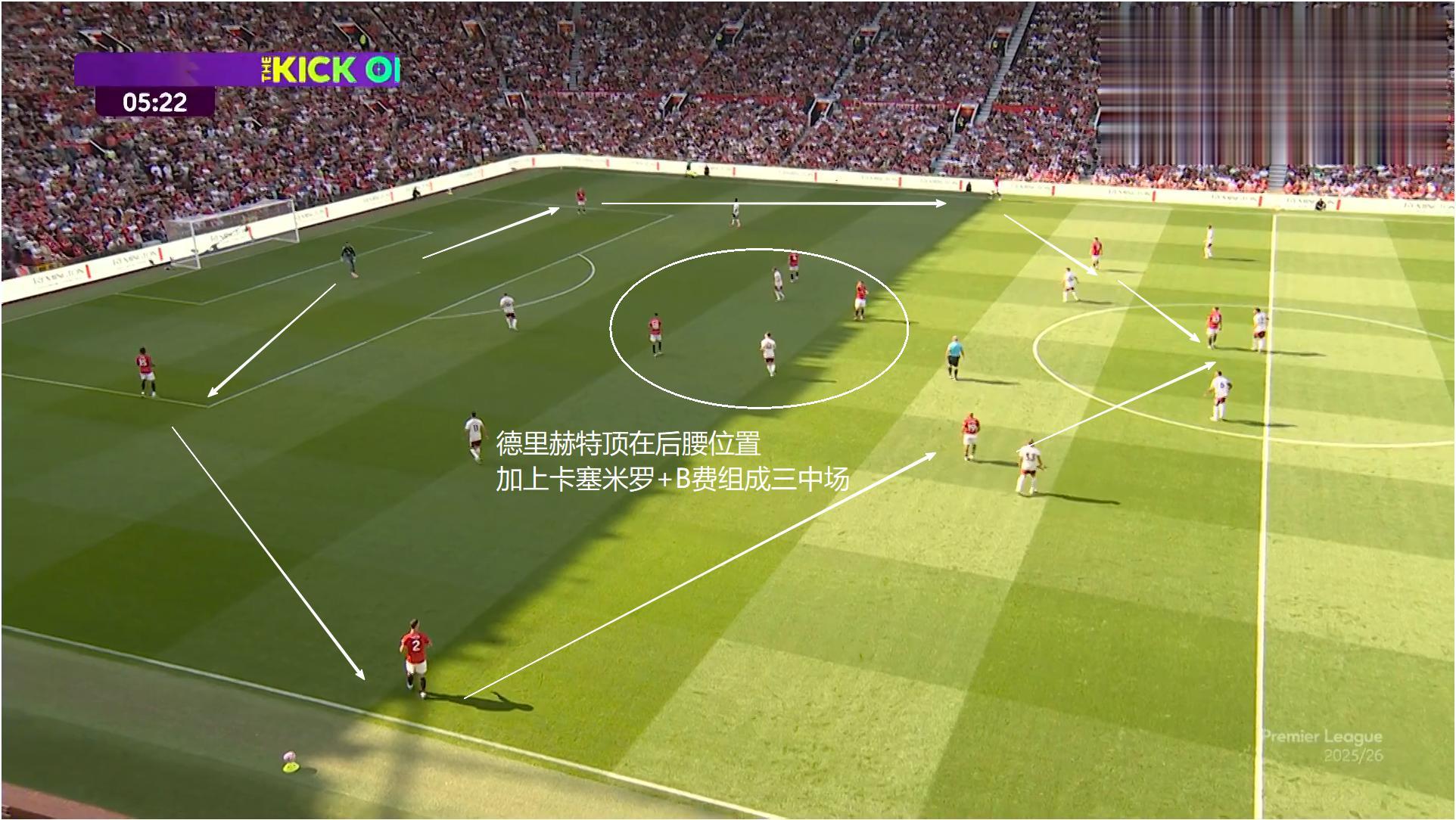 再望望曼联0-1阿森纳的,下图可以当作一个代表,曼联的三条线拉开之后,曼联的中场是有三个东说念主的,德里赫特压上去填补了中场的空间。