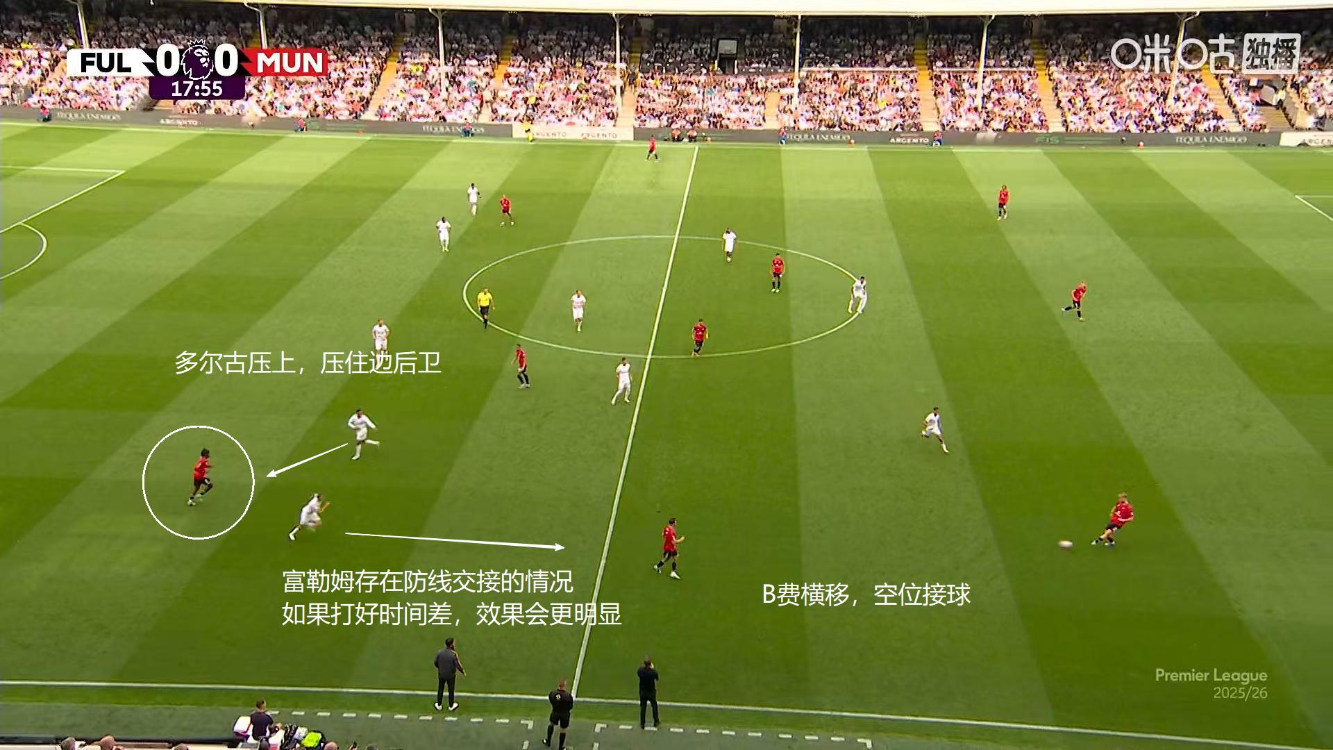 两场比赛的对比是有差距的,先看下两场比赛的方法诀别吧,下图是曼联1-1富勒姆的,你看出问题了么?后卫线、时尚线之间的精深区域,就填充了B费一个东说念主,卡塞米罗的位置更多被敌手压在德里赫特身边。