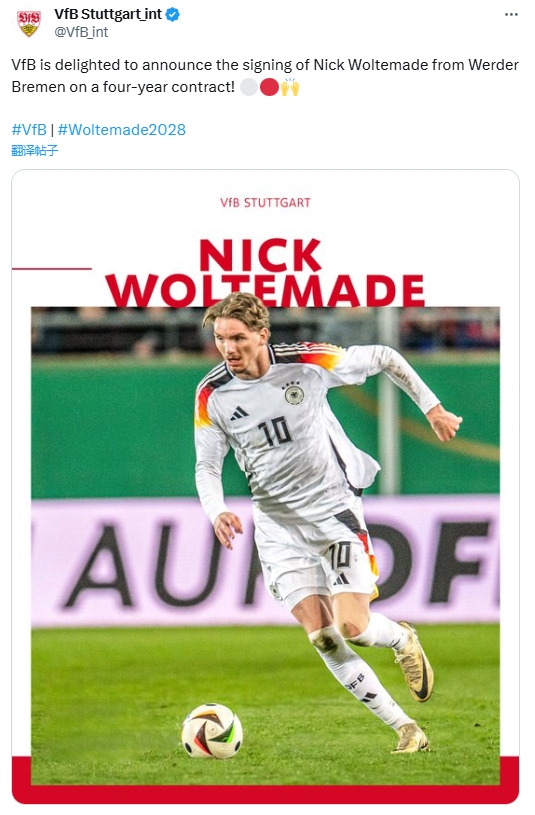8月29日讯 斯图加特先锋沃尔特马德行将加盟英超纽卡,据悉转会费可能高达9000万欧。