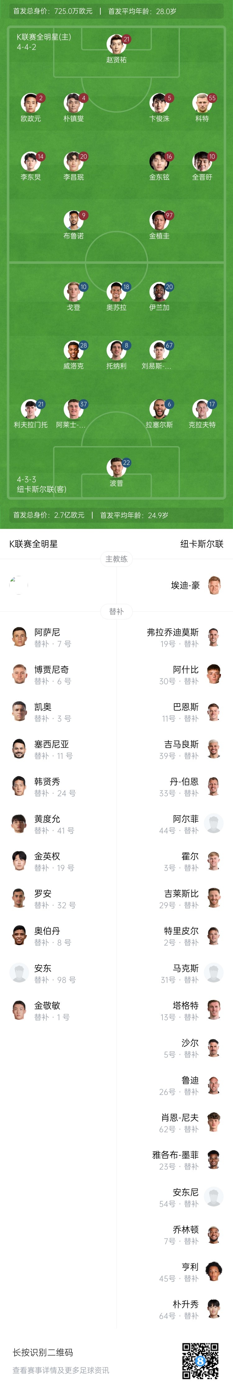 7月30日讯 足球友谊赛,K联赛全明星对阵纽卡斯尔联。上半场,纽卡方面半场1射正,控球率也逾期,戈登开场失良机,金植圭破门。半场战罢,纽卡0-1K联赛全明星。